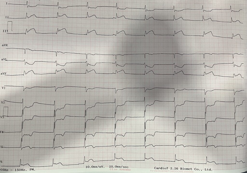 Pues bien, para las bradiarritmias en el contexto de IAM, la guía 2025 nos dice que la colocación de un marcapasos permanente está indicada. Y eso fue lo que buscamos hacer tan pronto arribó la paciente y, aun en la camilla de la ambulancia, la acercamos al monitor desfibrilador de nuestra área de reanimación, presentando a los pocos segundos crisis convulsivas asociadas a una frecuencia cardíaca de tan solo 20 lpm. Así que, como si se tratara de un código mega en ejercicio de simulación de ACLS, nuestro escenario es otro en unos pocos segundos. Hay que dar soporte de vida y se indica al personal disponible colocarse ante un inminente escenario de parada cardiorrespiratorio pero, nuevamente y trás unos pocos segundos, se observa en el monitor que la frecuencia cardíaca comienza a subir y la paciente muestra respuesta espontánea. Así de rápidos los cambios y cortos los escenarios.