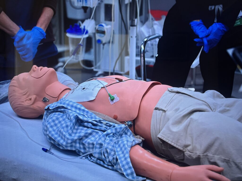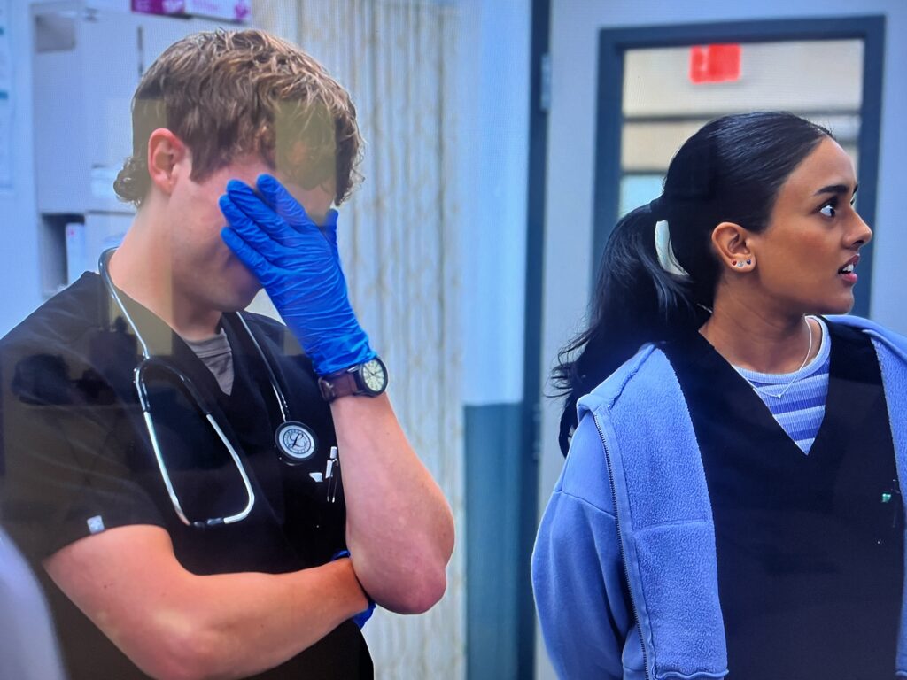 - ¿Aspectos técnicos relevantes? Muchos. Primero haré notar la simulación in situ (sí, esa que se lleva a cabo en el lugar donde se atienden los pacientes). Tras mencionarse que hay una nueva médica responsable, la Dra. Baran Al-Hashimi («una experta en informática clínica») y ver las reacciones que eso genera en Robby (quien partirá de la sala de urgencias por unos meses al terminar este día), vemos de inmediato a los ya conocidos Dennis Whitaker (ahora doctor, aunque su gafete con ese rango llegará hasta el episodio 9 de esta temporada, muy de acuerdo a su desempeño mostrado a lo largo de los capítulos de la segunda temporada) y Victoria Javadi (estudiante de 4o año ahora), y los nuevos estudiantes James Ogilvie y Joy Kwon, prodigios en verdad, pero en crecimiento. Todos ellos están inmersos en un escenario de simulación para la atención de un paciente en parada cardíaca con torsades de pointes. Bien, esta modalidad de simulación clínica, a diferencia de la práctica deliberada, permite evaluar no solo actitudes procedimentales, sino brinda la oportunidad para evaluar otras capacidades como la toma de decisiones clínicas, el trabajo en equipo y la comunicación. De las conocidas etapas de esta modalidad (prebriefing, escenario y debriefing), solo vemos las dos últimas. De las etapas del escenario (inicio, evolución y final) igualmente vemos solo las dos últimas, lo cual nos permite apreciar en solo 30 segundos el rol de liderazgo de «nuestro campesino», una comunicación deficiente, una actitud incluso negativa a lo que se comunica y otros puntos interesantes. Cuando la Dra. Baran entra en escena y termina el escenario declarando al paciente (un simulador que aparenta ser demediana fidelidad) fallecido, seguramente porque se terminó el tiempo destinado al escenario y sin que se identifique el ritmo específico y se otorgue el tratamiento necesario, inicia el corazón de la simulación, el debriefing. Esta plática «reflexiva» inicia sin contemplar las emociones generadas durante el ejercicio, algo importantísimo. Tampoco se recapitula el escenario para ver si todos los involucrados lo vivieron igual. Se pregunta, ¿qué salió bien? y, al identificarse una respuesta incorrecta, es la Dra. Al-Hashimi en rol de instructor quien otorgan las respuestas correctas para el diagnóstico y tratamiento. Luego el proceso es terminado sin cierre por la entrada de Robby en escena, por lo cual no puedo identificar claramente que modelo de debriefing estaba usando la Dra. Baran. Tal como sucedía con John Carter en la temporada 5 de ER donde fue enviado a hacer prácticas con paciente simulado por la calificación otorgada por Lucy Knight en su rol de alumna de Carter, el personaje actual de Wyle no muestra actitud positiva a la simulación clínica.